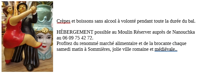 Crèpes et boissons sans alcool à volonté pendant toute la durée du bal. HÉBERGEMENT possible au Moulin Réserver auprès de Nanouchka au 06 09 75 42 72. Profitez du renommé marché alimentaire et de la brocante chaque samedi matin à Sommières, jolie ville romaine et médiévale.. |